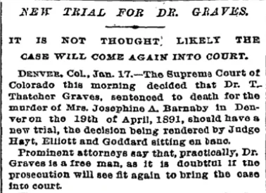 In 1891 the case was the sensation of the day. Nineteen of the leading newspapers of the country sent staff members to the trial. Dr. Graves was never technically proved guilty, and it is not proved that he committed suicide, but he was found dead in his cell on the eve of the second trial. Excitement ran high, and his former neighbors shuddered, to think there had doubtless been a murderer there in their midst.”